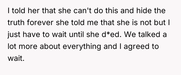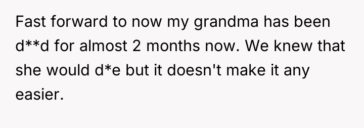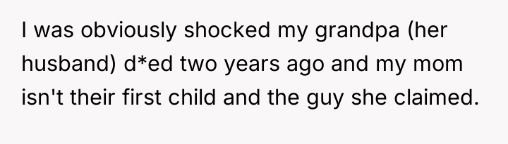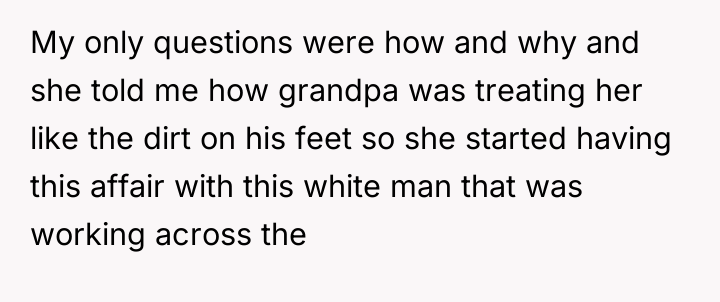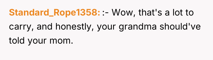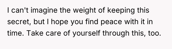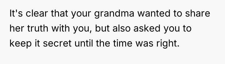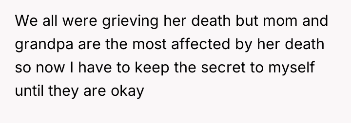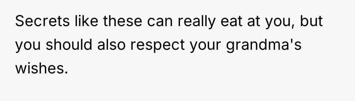 The original poster is left carrying a profound, life-altering secret about their mother's true paternity, a truth shared only in the final moments of their grandmother's life. This places the narrator in a difficult position, balancing the deceased grandmother's dying wish for silence against the immense weight of concealing such fundamental information from their grieving mother and grandfather.