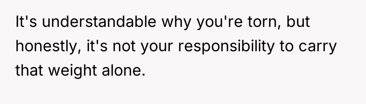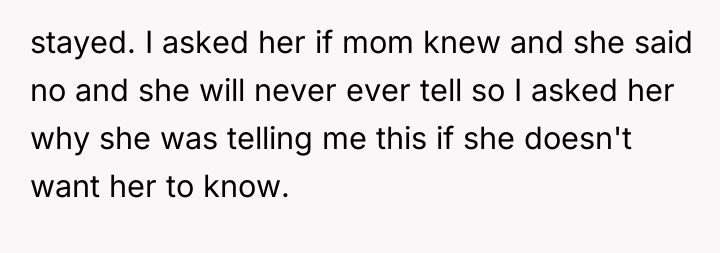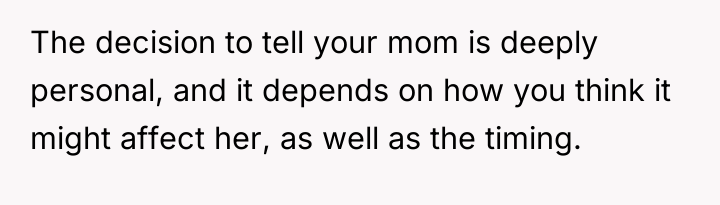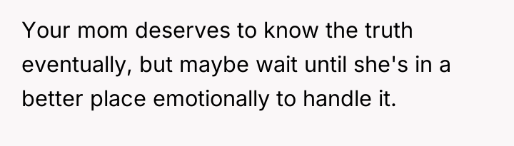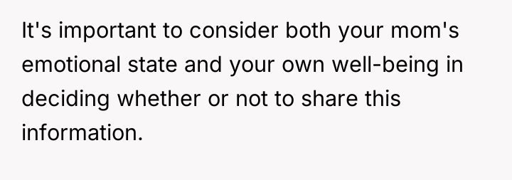From a communication standpoint, this situation demands careful boundary setting and future planning. The narrator's current role is unsustainable. A constructive recommendation would be for the narrator to begin seeking confidential counseling immediately to process the shock and prepare for the eventual disclosure, rather than letting the decision drift indefinitely. When the time comes, the disclosure should ideally be managed by professionals (like a therapist) to ensure that the mother receives the information within a supportive, controlled environment, rather than having it accidentally discovered later, which would compound the emotional damage.
