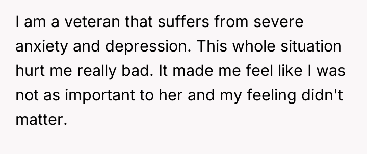 The husband experienced significant anxiety and emotional distress stemming from his wife's long-standing friendship with a man with whom she had a past sexual encounter. His attempt to address these feelings led to severe conflict, with his wife reacting defensively and accusing him of insecurity, causing him deep emotional pain and physical manifestations of stress.