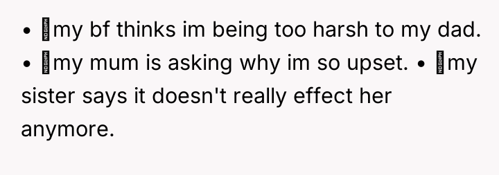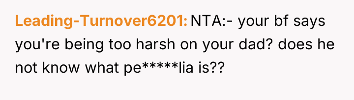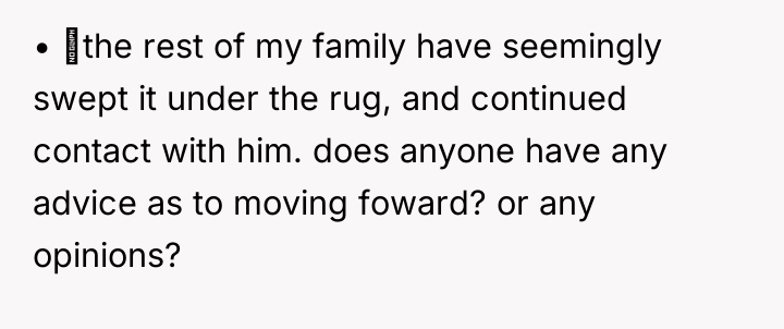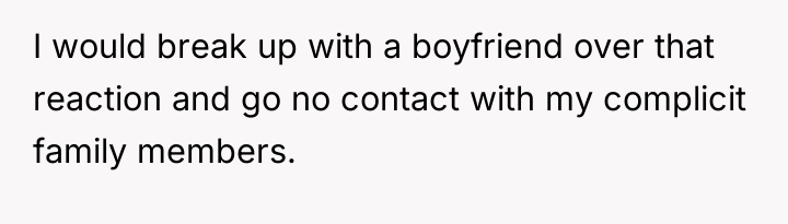 The boyfriend's comment suggests a failure to understand the gravity of sexual abuse and the necessary response to such a revelation, prioritizing the superficial maintenance of the family unit over the OP's moral reality. The OP's choice to cut off contact is appropriate for establishing necessary safety and integrity. Moving forward, the OP should seek external, objective support, such as therapy, to process the trauma and the secondary trauma of family invalidation. A constructive recommendation is to firmly hold the boundary with the father, while communicating clearly to other family members (if they choose to engage) that their boundary is non-negotiable for their own well-being, even if that means accepting temporary distance from those who do not support it.