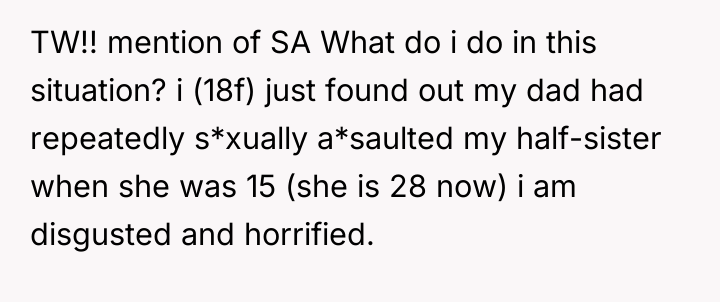 The original poster (OP) is experiencing profound shock, horror, and disgust upon learning about their father's past sexual assaults against their half-sister. The central conflict arises because the OP has completely disowned their father based on this discovery, while nearly every other family member—including the mother, the half-sister, and the extended family—has minimized the event or chosen to continue their relationship with the father, leaving the OP feeling isolated and unsupported in their moral stance.