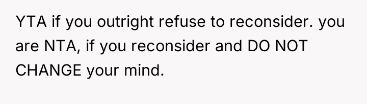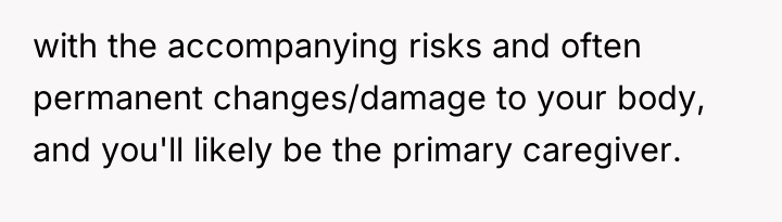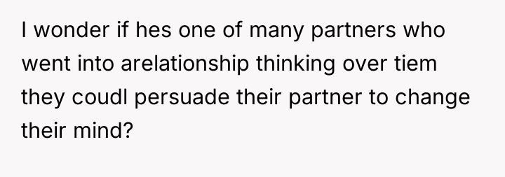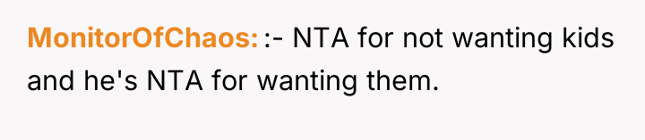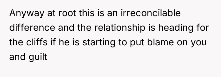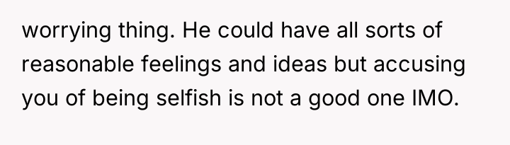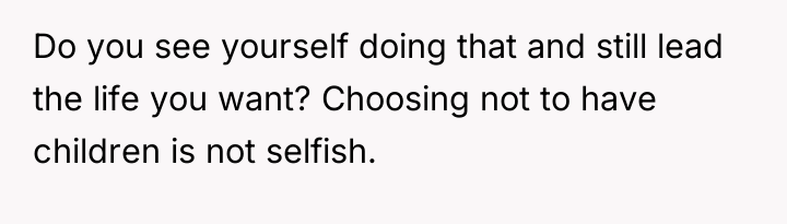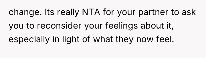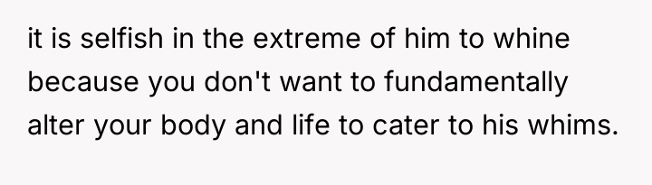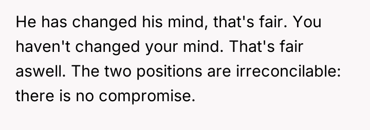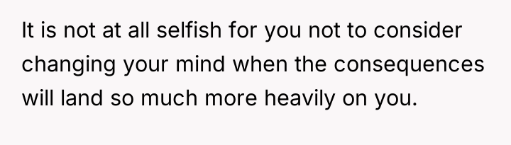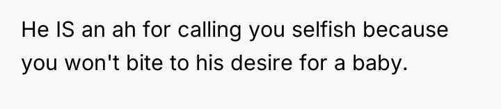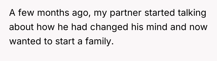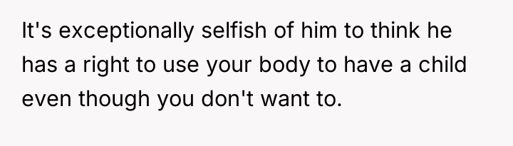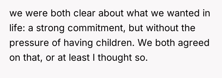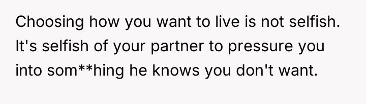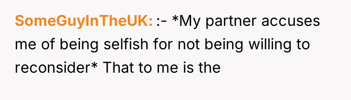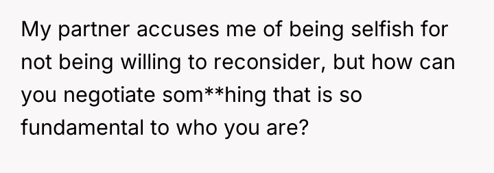 The partner’s shift from a mutual agreement to suddenly desiring children and labeling the OP as 'selfish' suggests an issue of emotional labor and boundary crossing. The OP is being pressured to compromise an immutable aspect of selfhood, which is psychologically damaging. A healthy relationship requires mutual respect for deeply held boundaries. Labeling the OP as selfish shifts the responsibility for the impasse onto the person maintaining their stated position, rather than acknowledging the partner's failure to honor the initial, clear agreement.