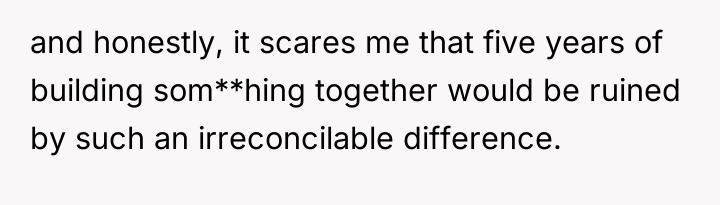 The individual faces a profound internal conflict, torn between the desire to maintain a deeply valued five-year relationship and the absolute necessity of upholding a fundamental life choice against their partner's sudden shift in desire. The core difficulty lies in the partner's accusation of selfishness when the personal stance on children is non-negotiable.