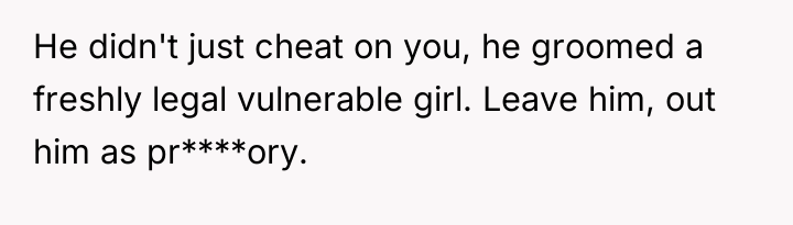 The wife in this situation is experiencing profound feelings of shock, betrayal, and disgust following the discovery of her husband's infidelity with a young student he was tutoring. Her conflict centers on honoring the extensive shared history and commitment of their nine-year marriage, including overcoming significant hardship, against the severity of his actions, which she perceives as predatory due to the student's age. She is questioning whether the desire to stay together for the children outweighs the damage done to her trust and self-worth.