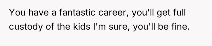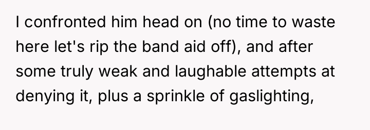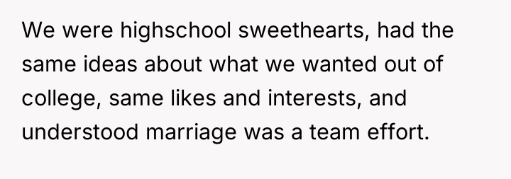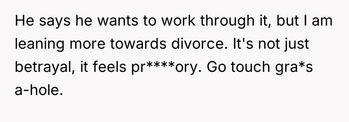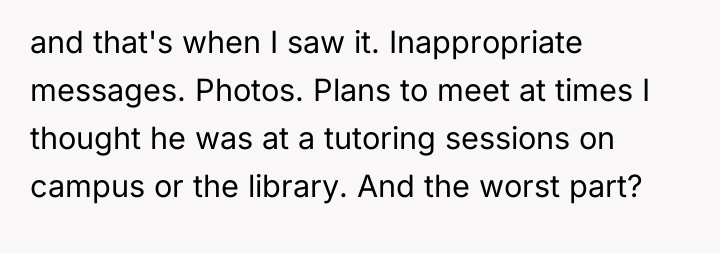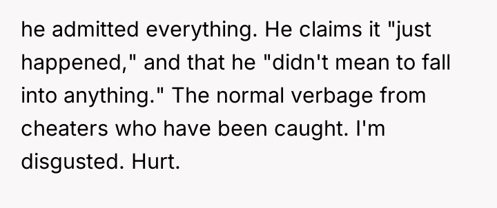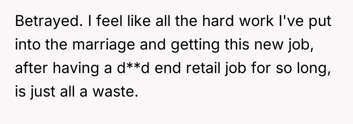The wife’s emotional response—feeling that her hard work and sacrifices (supporting him while SAHD, achieving a better job post-maternity leave) are invalidated—is a common reaction to betrayal, particularly when the spouse's actions create immediate insecurity. The husband’s immediate attempts at denial and gaslighting further compound the damage, signaling a prioritization of self-preservation over accountability. His claim that he "didn't mean to fall into anything" minimizes a conscious series of decisions involving inappropriate messaging and meetings.