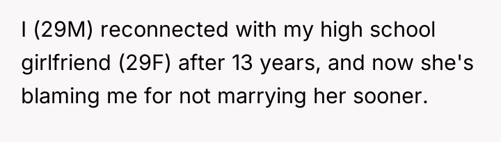 '29M Reconnected With My 29F High School Love After 13 Years—Now She Blames Me for Not Marrying Her Sooner'