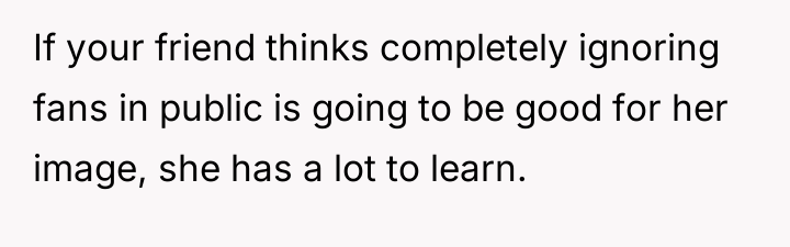 The original poster (OP) is facing a conflict between their established social norms regarding politeness and their friend's perceived professional obligations and boundaries as a public figure. The core issue lies in the OP's intervention on behalf of a young fan versus the friend's insistence on controlling her personal interactions, even in public.