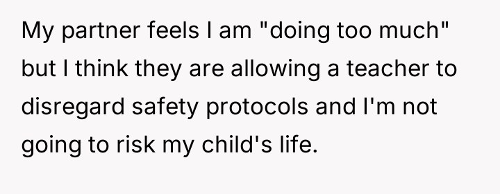The parent experienced significant frustration and fear when faced with repeated safety errors regarding their son's severe tree nut allergy, particularly the teacher's dismissive attitude and subsequent violation of facility rules concerning peanuts. The central conflict lies between the parent's urgent need to enforce strict safety protocols to protect their child and their partner's perception that the reaction was an overreaction given the specific, non-life-threatening circumstances of the peanut butter exposure.