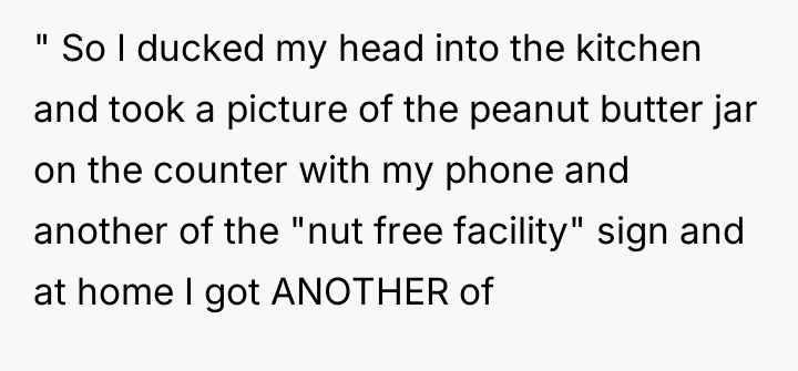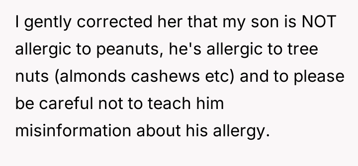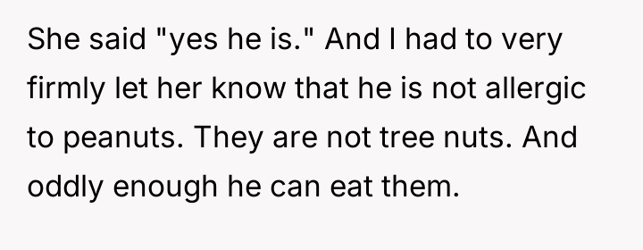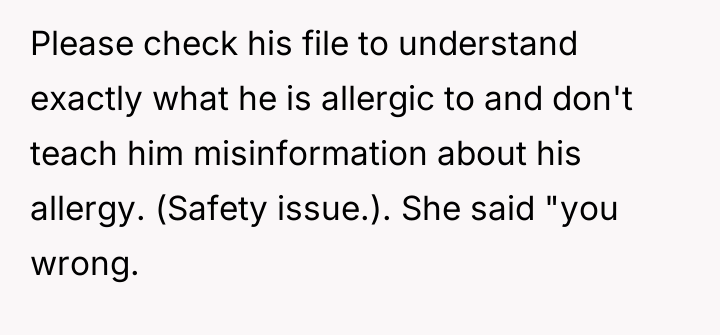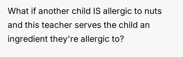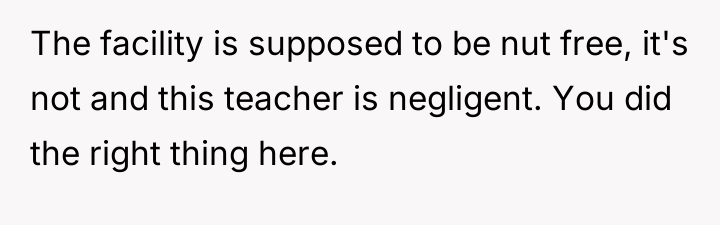 The teacher's behavior is highly problematic. Her initial denial of the parent’s factual correction regarding the difference between peanut and tree nut allergies demonstrates a failure in basic professional competency and respect for parental expertise regarding their own child's health data. This denial escalated the situation from a simple misunderstanding into a safety boundary violation. The subsequent use of SunButter while implying it was entirely safe, followed by the documented presence of actual peanut butter in a self-proclaimed 'nut-free' zone, confirms a systemic breakdown in protocol adherence and communication within the staff.