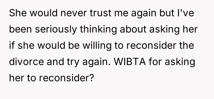 Given the depth of the betrayal and the finality of her departure, is it justifiable for the husband to ask his ex-wife to reconsider the finalized divorce and attempt to rebuild a relationship based on a foundation of broken trust?