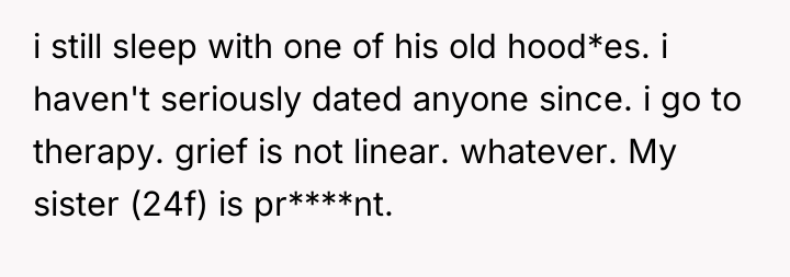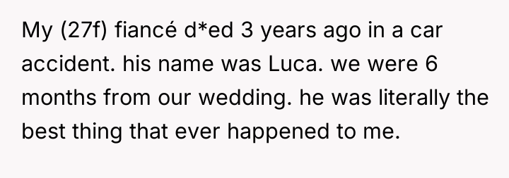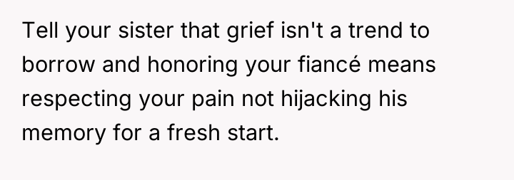The original poster is navigating intense, unresolved grief over the sudden loss of her fiancé, a loss that occurred just before their planned wedding. The central conflict arises when her younger sister disrespectfully co-opts the fiancé's name for her unborn child, directly triggering the poster's trauma and sense of ownership over her deceased partner's memory.
