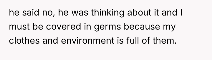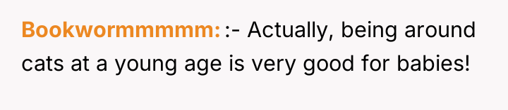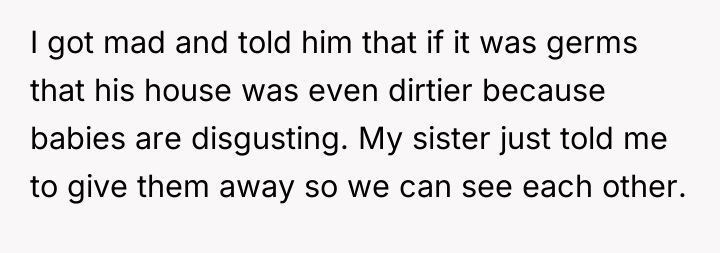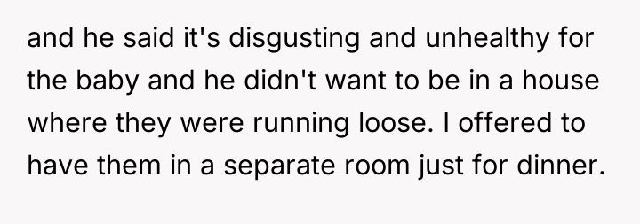 The husband's demand to give away the cats represents an extreme boundary violation, framing the OP's beloved pets as an unacceptable threat to his child's health. The OP's initial attempt to compromise (containing the cats) was rejected, escalating the tension. The OP's subsequent retort that babies are 'gross too' is a clear example of reactive defensiveness, an emotional blowback intended to neutralize the husband's judgment by leveling an equally hurtful accusation. While understandable as an expression of anger, it severely damaged the communication channel.