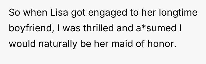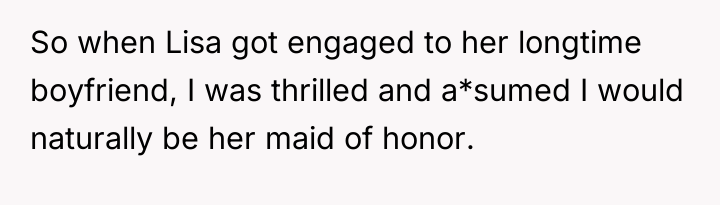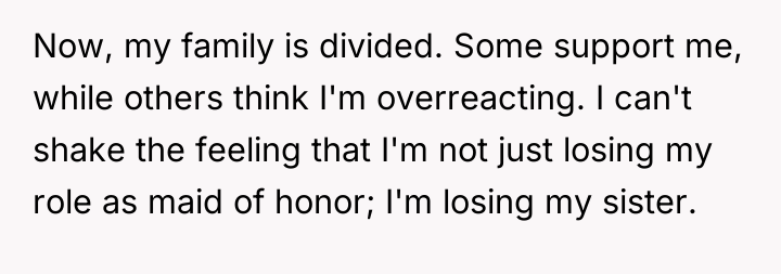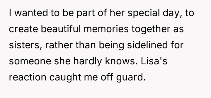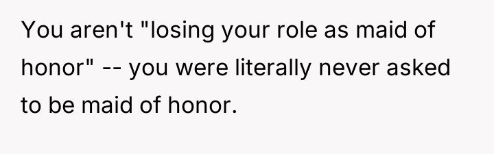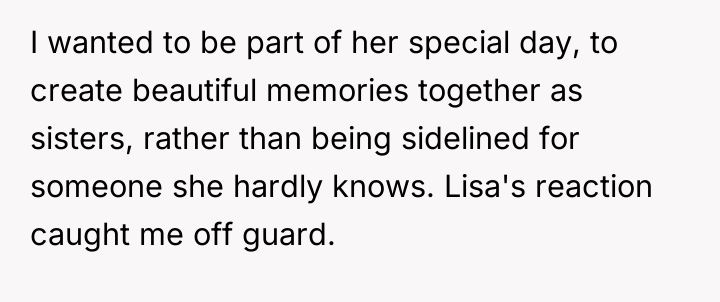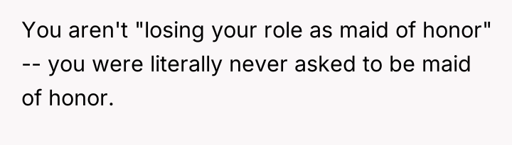 Dr. Harriet Lerner, a clinical psychologist renowned for her work on boundary setting and family relationships, often emphasizes that healthy relationships require mutual respect and clear communication about personal needs. In this scenario, the user (OP) experienced a significant violation of her perceived relational contract with her sister, Lisa. The promotion of a relative stranger—a celebrity—to the Maid of Honor role, especially one who has been a consistent support system, signals a breakdown in acknowledging the history and depth of their bond.