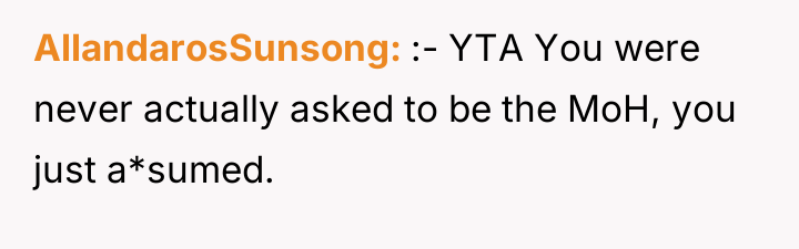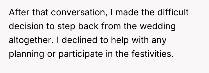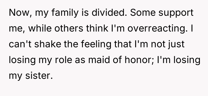 The original poster experienced deep emotional pain when her sister replaced her as maid of honor with a celebrity acquaintance, leading to a significant conflict between her expectation of familial priority and her sister's pursuit of social excitement. This disagreement escalated to the point where the poster withdrew entirely from wedding participation, feeling undervalued and fearing the loss of their sisterly relationship.