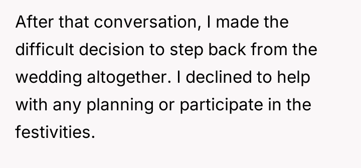 Is the poster justified in withdrawing from the wedding to protect her emotional well-being after feeling devalued, or should she have prioritized supporting her sister's choices, even if painful, to maintain familial peace and involvement in the celebration?