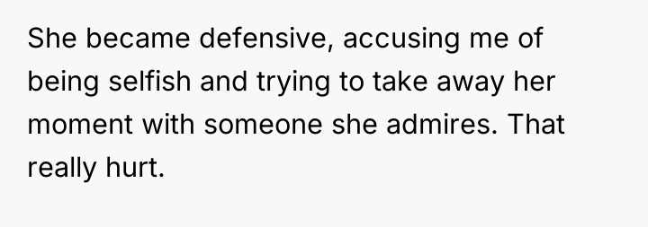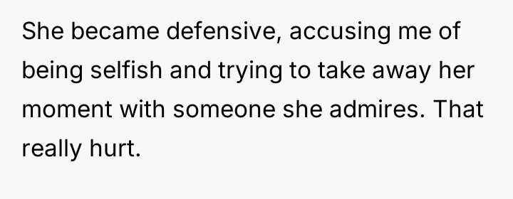 Lisa's reaction, immediately shifting to defensiveness and labeling the OP as 'selfish,' suggests a failure in emotional regulation and an inability to validate her sister's genuine hurt. This is a classic pattern where one person's excitement or desire (Lisa's desire for a high-profile attendant) overrides their responsibility to maintain emotional equilibrium with a primary attachment figure (OP). The OP’s subsequent decision to step back, while emotionally driven, was a strong assertion of a boundary, signaling that her presence was conditional on feeling respected. However, completely removing herself might create a larger rift than necessary.
