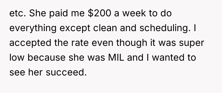 The OP's action to quit was appropriate given the unsustainable nature of the relationship, especially after the MIL’s spending prioritized a vacation over rent, demonstrating a continued disregard for the structures the OP built. For future situations, the constructive recommendation is to establish clear, written service agreements outlining scope, compensation, and termination clauses *before* beginning any work, and to maintain rigid separation between family obligation and professional management. If the client (the MIL) refuses to adhere to mutually agreed-upon financial discipline, the professional relationship must be terminated without feeling obligated to provide remedial training for behavior already addressed.