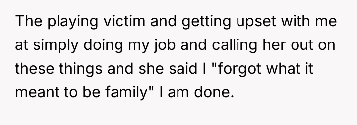 The person in this situation is clearly exhausted from managing both a demanding professional role and the emotional burden caused by their mother-in-law's behavior. The central conflict lies between the individual's professional necessity to set financial boundaries and maintain the business's health, and the family expectation to provide continuous, unpaid emotional and administrative support, even when that support is unappreciated or actively undermined.