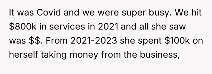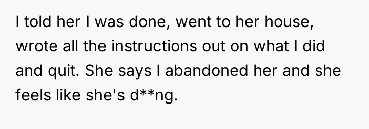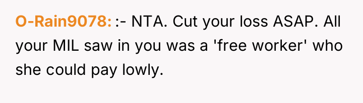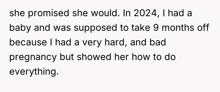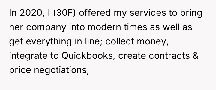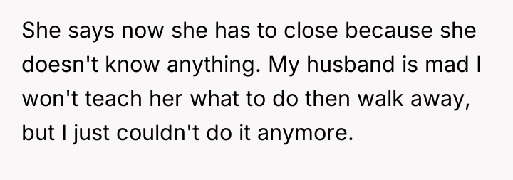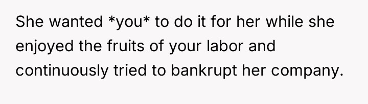The OP invested significant time, skills, and emotional labor—agreeing to low pay initially, returning early after childbirth, and repeatedly saving the business from collapse. When the MIL claimed she felt 'abandoned' after the OP quit, this reinforces the pattern where the OP is expected to prioritize the MIL’s emotional comfort and dependence over their own well-being and professional capacity. The husband’s reaction suggests an adherence to the family dynamic that values appeasement over self-preservation for the OP.