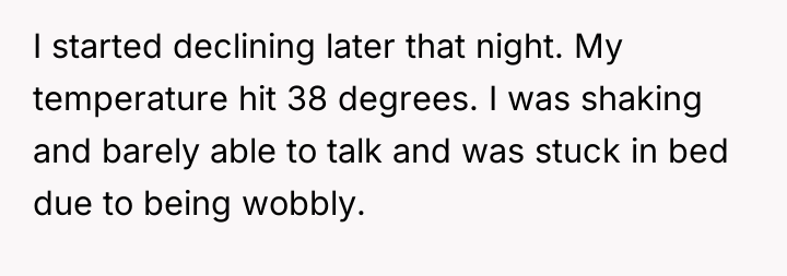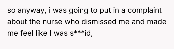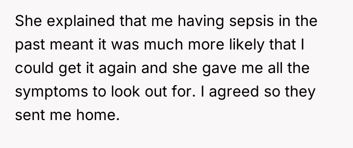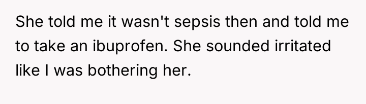 The mother's motivation to report is rooted in protecting future vulnerable patients, especially those with known high-risk profiles like previous sepsis survivors. The nurse's action—dismissing critical symptoms (fever above 38°C, inability to walk) based on a single, easily verifiable, but insufficient metric (urination frequency)—demonstrates a failure in adhering to established sepsis screening protocols and a lapse in professional empathy. This is compounded by the clear instruction given by the walk-in clinic doctor, which the nurse ignored. Psychologically, the poster experienced a form of invalidation, leading her to suppress her needs, a common reaction when a patient believes they are 'bothering' a professional.