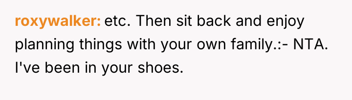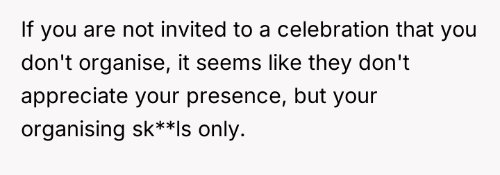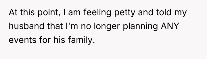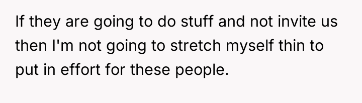 The OP's decision to stop planning is an understandable response to feeling unappreciated and disrespected, acting as a form of self-protection against further emotional labor that yields no positive return. However, stopping all planning is a passive form of protest. A more constructive approach, recommended by experts in interpersonal communication, would be to pause the planning and then engage in a calm, direct discussion with her husband about the pattern of exclusion and the need for mutual respect regarding family obligations. The goal should be to establish clear expectations for invitations and reciprocity moving forward, rather than simply withdrawing effort.