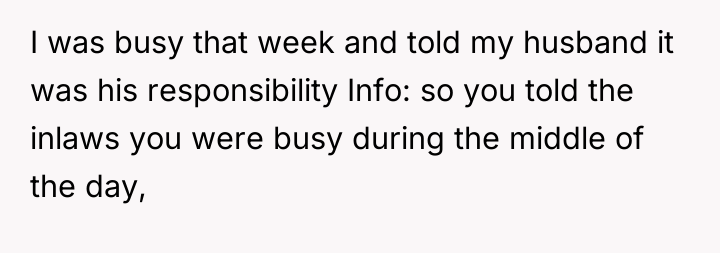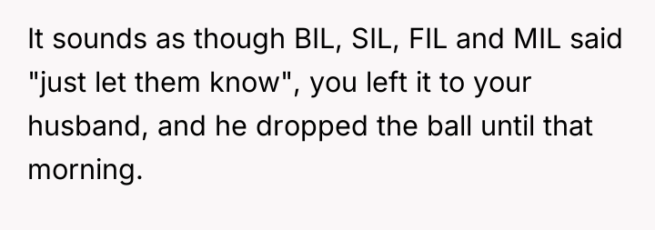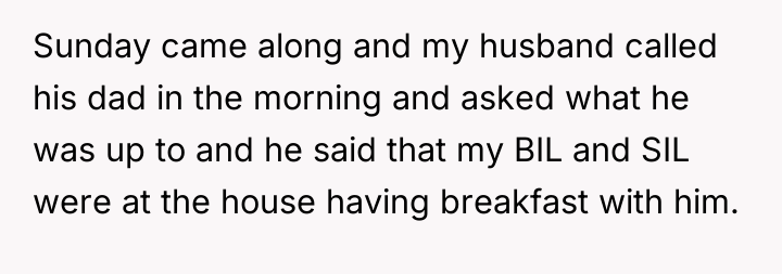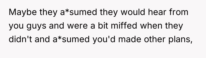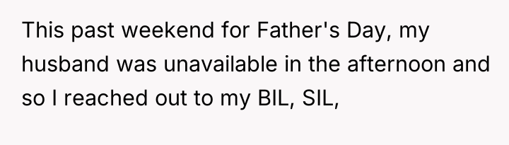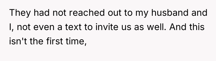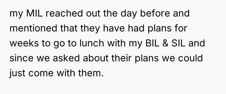 The in-laws' pattern of planning events without inviting the OP and her husband suggests either a fundamental misunderstanding of the OP's role, a distinct boundary around their immediate family unit (husband, BIL, SIL), or simply poor communication habits. When the OP made her husband responsible for Father's Day planning, the resulting exclusion revealed the underlying dynamic: the in-laws were comfortable interacting with the husband and his siblings without including the OP or even informing her of the plans. This exclusion validated the OP's feelings of being an outsider.