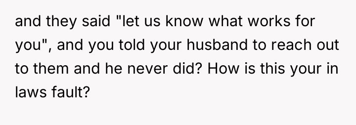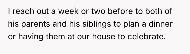 Dr. Harriet Lerner, a clinical psychologist known for her work on boundaries and family dynamics, often emphasizes the importance of asserting one's needs clearly rather than relying on passive-aggressive withdrawal. In this situation, the wife (OP) has invested significant emotional labor into maintaining inclusive family relationships, consistently initiating contact and planning for her husband's side of the family.