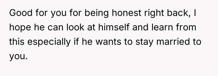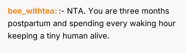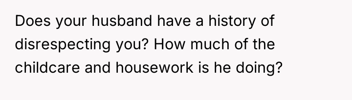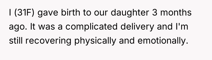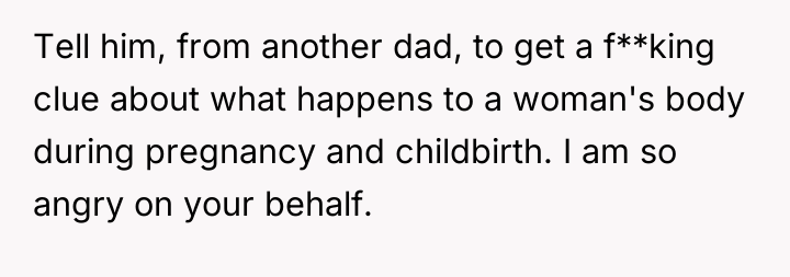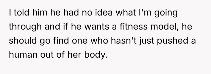 The wife’s reaction, while intense, was a direct, understandable response to feeling betrayed and unappreciated during a time of extreme vulnerability. Moving forward, both parties need improved communication. The husband needs to understand that unconditional support is vital postpartum. The wife could benefit from stating her needs clearly, perhaps saying, "Right now, my body is healing, and I need your support, not critiques of my looks." The immediate constructive step for the husband should be to apologize specifically for the timing and insensitivity of his comment, acknowledging her physical journey.