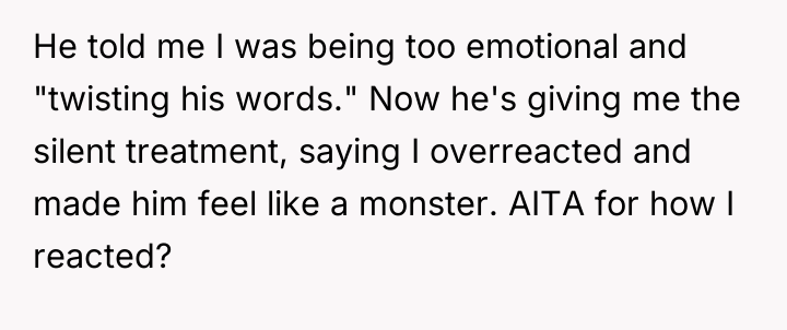 The husband's comment demonstrates a severe lack of situational awareness and empathy. Postpartum recovery involves significant physical trauma, hormonal shifts, and sleep deprivation, which naturally alters a person's focus away from aesthetic concerns. By focusing on her appearance rather than her well-being, the husband prioritized his own aesthetic preference over validating her monumental physical effort. When the wife reacted strongly, his dismissal of her feelings by labeling her as "too emotional" and twisting her words is a classic deflection technique, shifting responsibility for the conflict onto her reaction rather than his initial hurtful statement. This behavior undermines trust and creates an unsafe emotional environment.