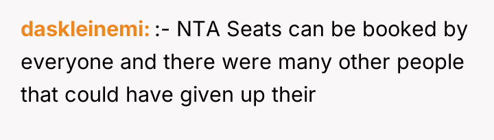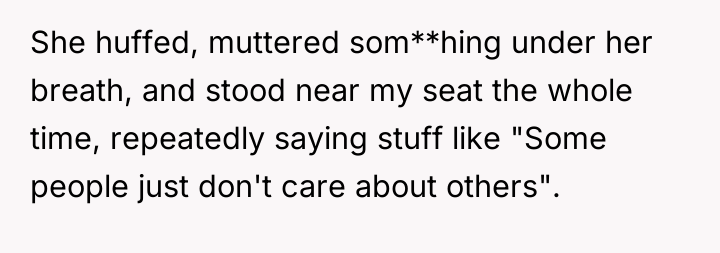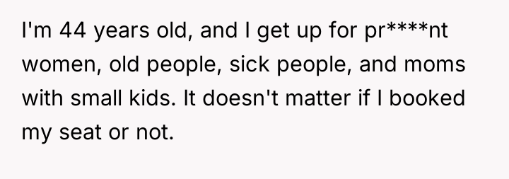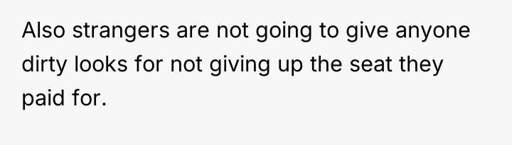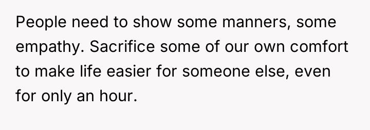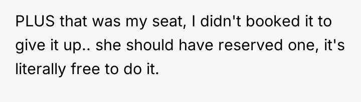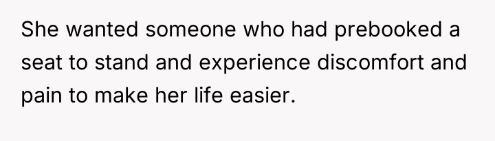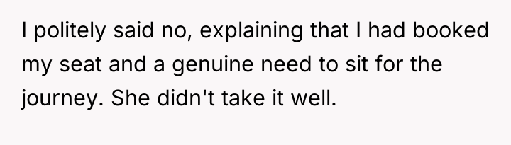 The individual faced a direct conflict between maintaining a pre-booked necessity due to physical discomfort and responding to a social appeal based on perceived need (caring for a young child). While the user adhered to the transactional agreement of their ticket, this adherence resulted in significant social pressure and negative judgment from the mother and other passengers.