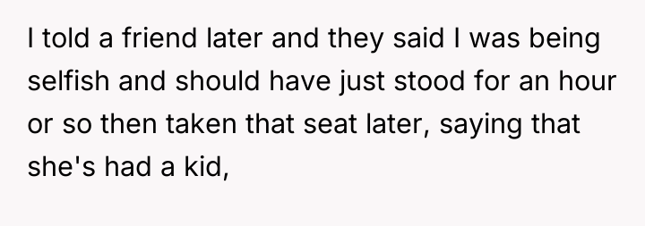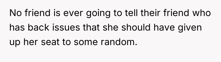 The situation highlights a common tension regarding social obligations versus personal boundaries. In public transit, while courtesy is expected, reserved seating is a form of purchased entitlement. The OP was within their rights to keep the seat, especially given a medical consideration (back issues). However, the friend's suggestion reflects societal norms where parental status often triggers an expectation of automatic deference, regardless of the other party's documented need or right. The mother's reaction escalated the situation unnecessarily by turning a transactional disagreement into a character judgment against the OP.