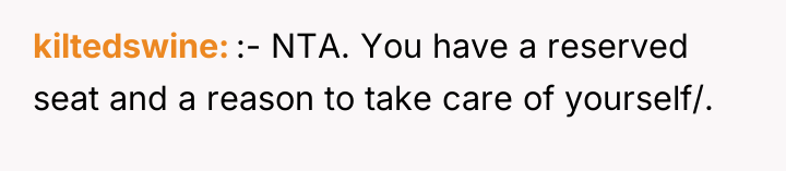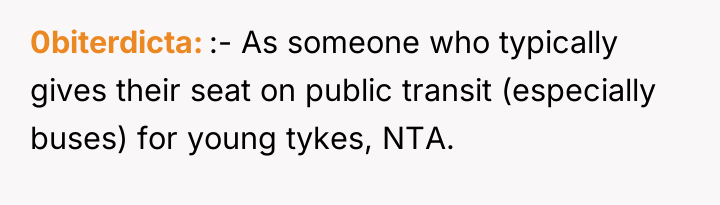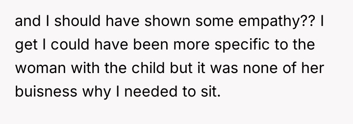 Should an individual with a medically justified need for a reserved seat prioritize their physical well-being over a temporary request from another passenger, even when that passenger is managing a young child? Or does the immediate, visible need of a parent with a small child ethically override a personal reservation, regardless of the underlying reason?