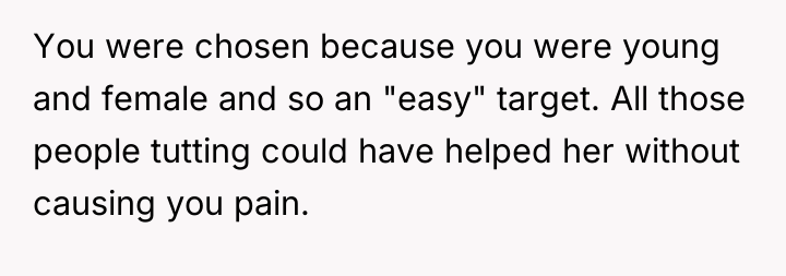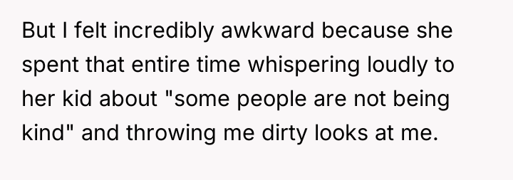 According to Dr. Leon Festinger's Social Comparison Theory, the conflict here is intensified by the public nature of the request. When the original poster (OP) declined, the mother immediately engaged in upward social comparison and public shaming tactics (muttering, negative comments directed at the child) to justify her position and recruit social support from bystanders. This behavior shifts the focus from a private request to a public moral judgment against the OP.