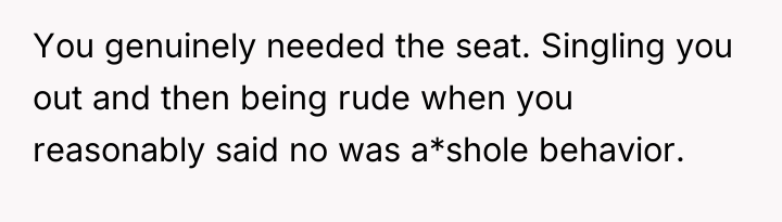 From a perspective based on clear boundary setting, the OP communicated their need clearly, although perhaps insufficiently detailed to satisfy the solicitor. For future situations, a brief, firm response stating, "I apologize, but I have a medical need for this seat and cannot move," followed by a cessation of further engagement, is the most constructive approach. This affirms the boundary without over-explaining, which often invites debate.