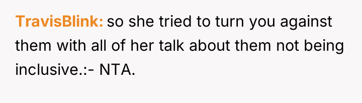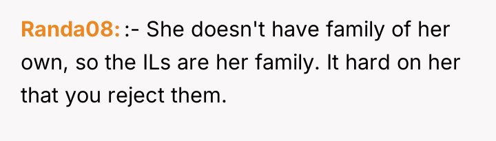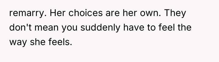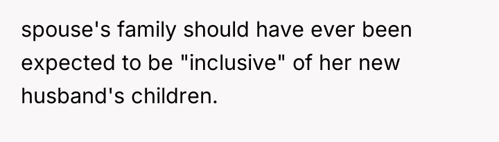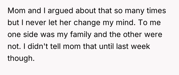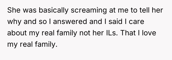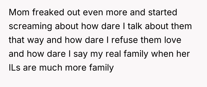 Given the long-standing emotional division and the narrator's firm declaration of who constitutes their 'real family,' is the mother justified in feeling profoundly betrayed and demanding recognition for her in-laws, or does the narrator have an unconditional right to define their primary familial loyalty based on personal history and emotional connection, regardless of the new family structure?