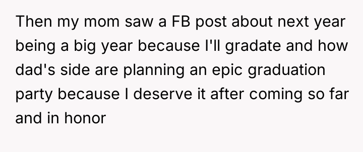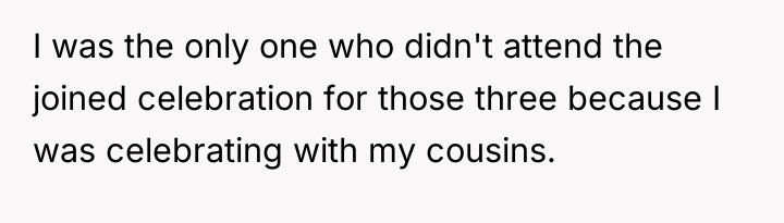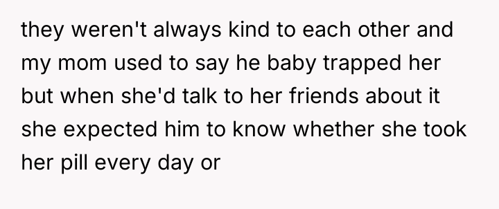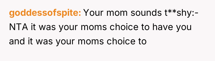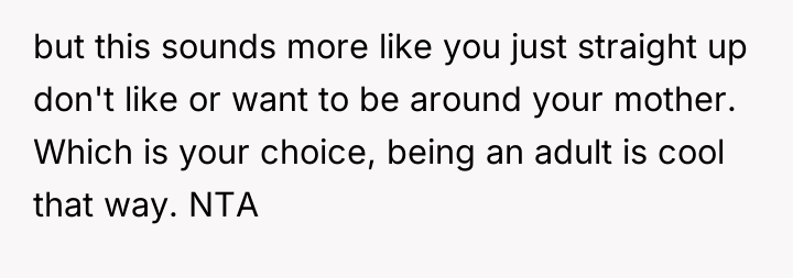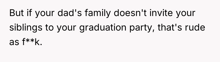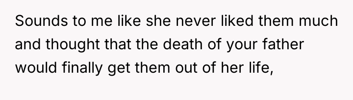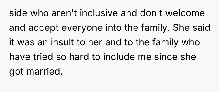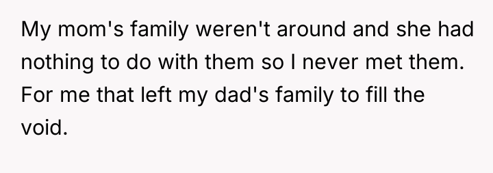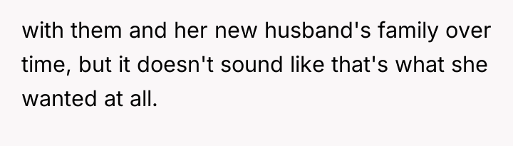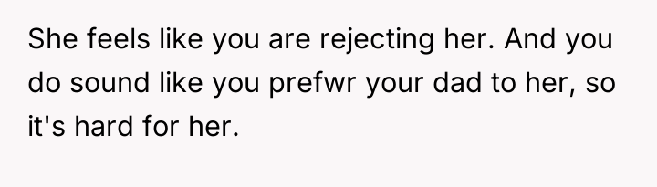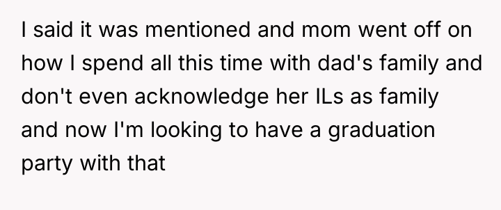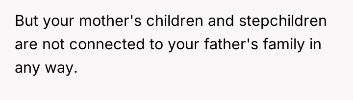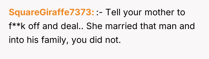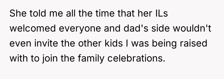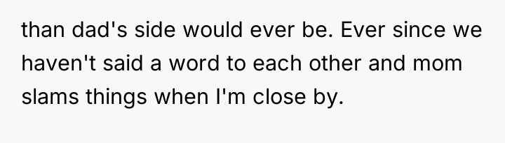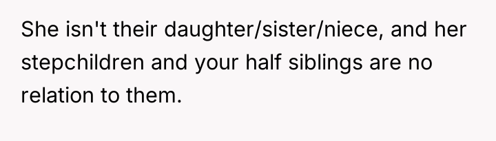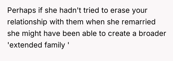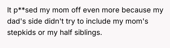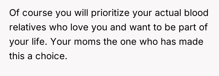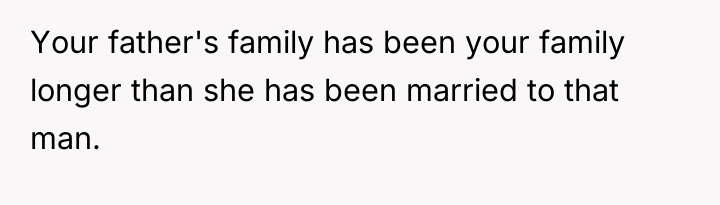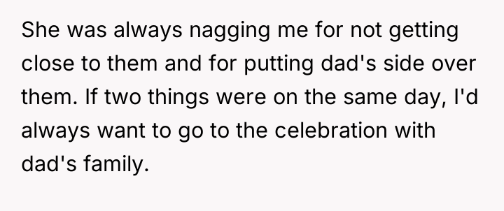 The narrator’s consistent behavior, prioritizing paternal family events over the step-family’s events over many years, shows a clear, albeit unspoken, boundary setting. The mother’s motivation appears rooted in a need for her current family unit (including her husband and his relatives) to be perceived as cohesive and fully accepted, viewing the rejection of her in-laws as a personal rejection of her current marital choices and identity. The narrator's final statement that the paternal side is 'real family' and the other is not, while emotionally honest for the narrator, functions as a high-stakes communication that directly invalidates the emotional labor and structure the mother has invested in her second marriage, leading to an extreme reaction characterized by silent treatment and aggressive non-verbal communication.