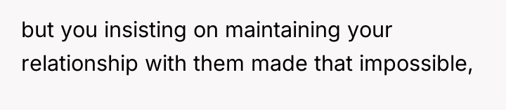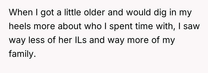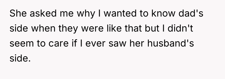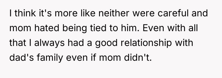 From a developmental perspective, the narrator is asserting autonomy over their narrative and emotional attachments, which is developmentally appropriate, though the delivery was highly provocative. A more constructive approach would have involved proactive, calm communication about identity prior to the confrontation, perhaps stating, 'I value my relationship with Dad’s family deeply because they connect me to my past. I respect your relationship with your in-laws, but I cannot force myself to feel the same connection to them.' The mother’s current reaction of silent hostility is a form of emotional stonewalling, which prevents resolution.