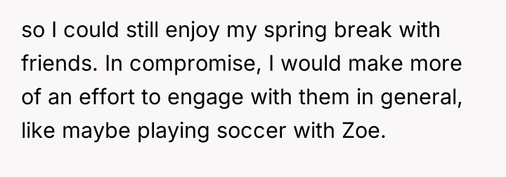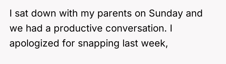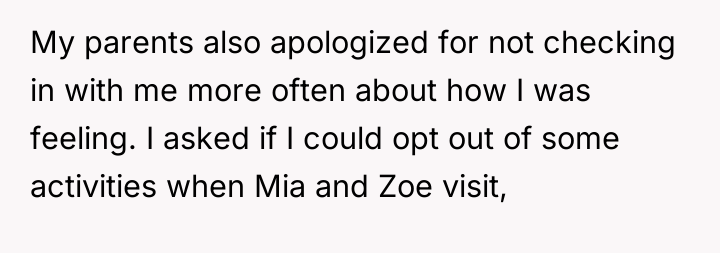 The individual ultimately recognized that their negative reactions were driven by personal feelings of being overlooked and increased pressure during their senior year, not by the fault of their sister and niece. They achieved a compromise with their parents, balancing their need for personal time with a commitment to engage more with the visiting family members.