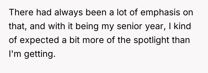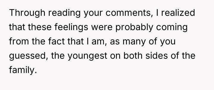 According to developmental psychologist Erik Erikson, adolescence and young adulthood are critical periods for establishing a sense of identity and autonomy. The poster, facing the transition to college, is likely experiencing heightened sensitivity regarding their status within the family structure, especially as a 'youngest child' who may be accustomed to a certain level of focus.