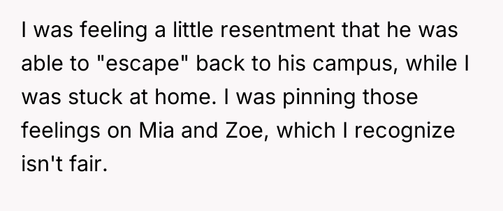The poster's resentment toward their brother for 'escaping' to campus highlights a clear struggle with perceived inequity in emotional labor and freedom. By projecting these frustrations onto the sister (Mia) and niece (Zoe), the poster violated the principle of boundary setting—they failed to address their feelings toward their parents and the situation directly, instead displacing them onto less responsible parties. The positive outcome here stems from self-recognition, aligning with principles of emotional intelligence, where understanding the root cause (feeling devalued) mitigates the need for conflict with secondary targets.
