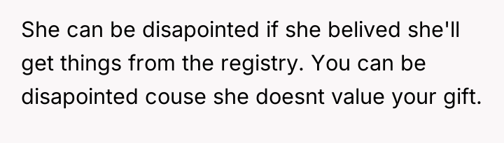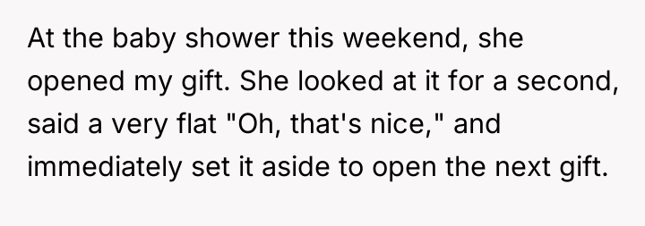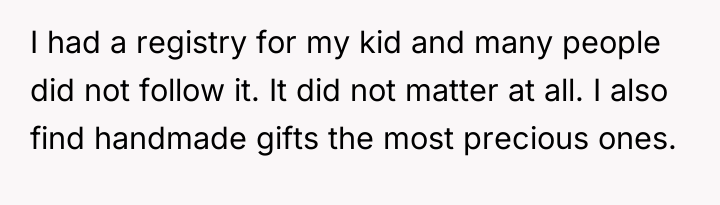 The gift-giver experienced deep hurt and embarrassment after investing significant time and effort into a personal, handmade gift, only to have it seemingly dismissed by the expectant mother who prioritized items based strictly on a high-end registry list.