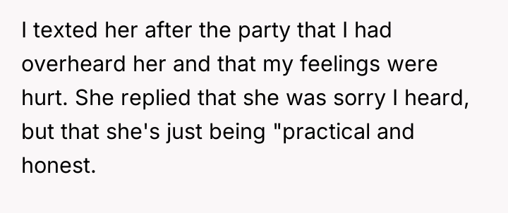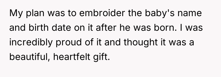 The gift-giver's actions were an understandable reaction to rejection of her effort, but responding via text about an overheard comment was less effective than addressing the issue calmly later, or perhaps not at all, given the impending stress of the baby's arrival. For future interactions, the gift-giver should manage expectations by either contributing financially toward a registry item or by keeping highly personal, time-intensive gifts private until the event, understanding that high-end tastes often correlate with a lower appreciation for non-monetary value.