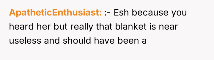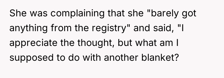 The sister-in-law displayed a lack of emotional intelligence by publicly devaluing a labor-intensive gift. Her statement about 'another blanket' and wishing people would stick to the registry suggests that she views gifts primarily as transactional solutions to logistical problems, rather than expressions of goodwill. The gift-giver, though correct in feeling hurt by the dismissal, escalated the situation by confronting the sister-in-law immediately about the overheard comment. While her feelings are valid (this is a form of emotional labor being rejected), direct confrontation about overheard gossip often puts the other party on the defensive, leading to the sister-in-law justifying her response as being 'practical.'