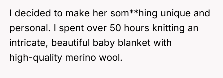 In a world where love often speaks through grand gestures and expensive gifts, one woman chose the quiet, heartfelt language of her hands. She poured over fifty hours into a meticulously knitted baby blanket, weaving not just wool, but hopes, dreams, and a deep affection for her sister-in-law’s unborn child. It was a gift born from genuine care, a symbol of love far beyond price tags.
