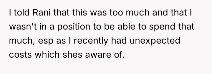 The OP’s actions regarding the refusal to buy the ticket were appropriate given their financial constraints. However, the subsequent statement diminishing the activity was inappropriate because it attacked the friend's self-esteem rather than maintaining a boundary based on cost. A more constructive approach would have been to affirm support for Rani while firmly stating the financial boundary: 'I am so proud of you for doing this, but I simply cannot afford the $70 ticket right now due to my unexpected costs. I wish I could be there, but I need to keep my savings intact.'