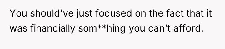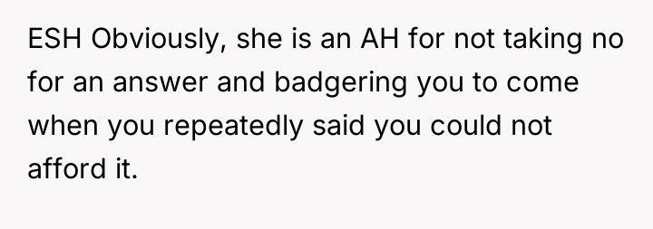 When personal limits clash with another's expectations of support, is prioritizing financial safety over an expensive, non-essential social event an understandable act of self-preservation, or does it represent a failure to acknowledge and validate a friend's enthusiasm, regardless of cost?