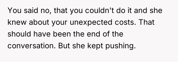 The individual faced a direct conflict between their strict, necessity-driven financial management and a friend's expectation of costly social support. This tension highlights the difficult navigation required when balancing personal security with the emotional demands of maintaining a close relationship.