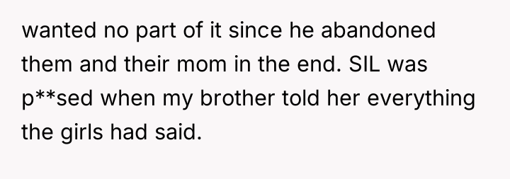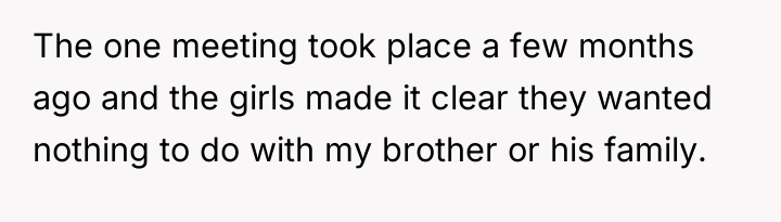 The OP's brother and SIL significantly mishandled the reintroduction of the nieces. The brother's decade-plus absence established a clear boundary: he chose his new life over his existing daughters. When they re-engaged, the SIL amplified the situation by actively fostering expectations in her children that a new family unit would instantly form, without consulting the now-adult nieces about their willingness or emotional capacity. This created manufactured hope, and when the nieces understandably asserted their boundaries, the resulting blame shifted unfairly onto them. This dynamic is a classic example of emotional labor being demanded from the injured party to soothe the guilt of the perpetrator and the disappointment of secondary parties.