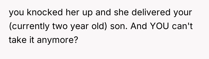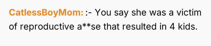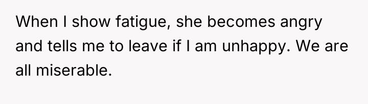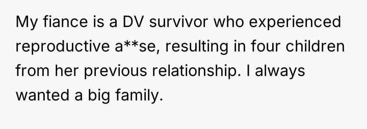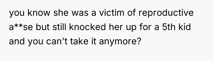 The fiancé's reaction—anger and telling the partner to leave when exhaustion is expressed—is a common defense mechanism in situations of severe caregiver burnout, especially when the root cause (reproductive abuse) is tied to her original trauma. She likely perceives any complaint as a threat to her current stability or as a judgment on her choices as a mother. The partner is effectively managing the ongoing consequences of the fiancé's reproductive abuse, creating a dynamic where the partner feels resentful and trapped, while the fiancé feels attacked and unsupported in her established coping structure.