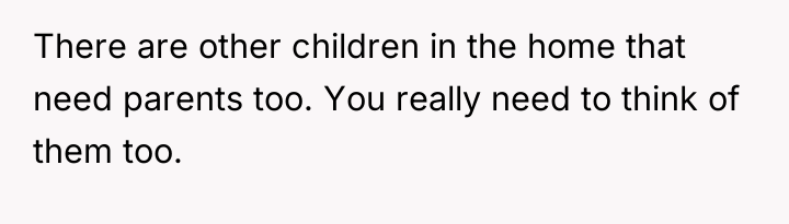 The fiancé is caught between a deep commitment to her partner and her existing children, who are suffering under the overwhelming daily reality of caring for a severely disabled child. Her denial and reactive anger when faced with the partner's exhaustion highlight an intense internal conflict between protecting her children and acknowledging the unsustainable nature of their current situation.